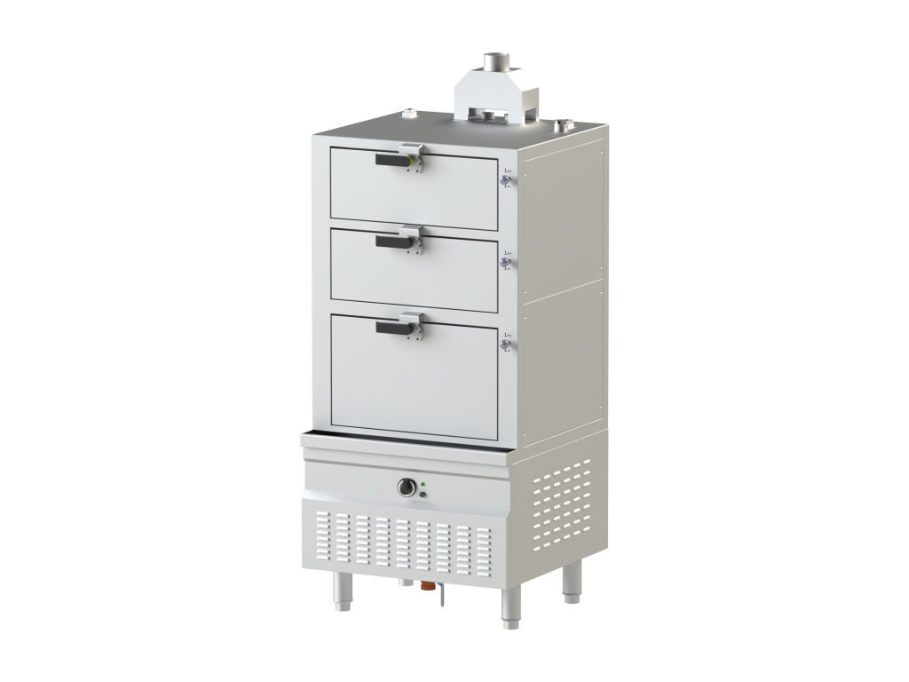 Gas steam cabinet with three decks. Equipped with high-performance burners with a total of 33 kW power rate for quick steam.